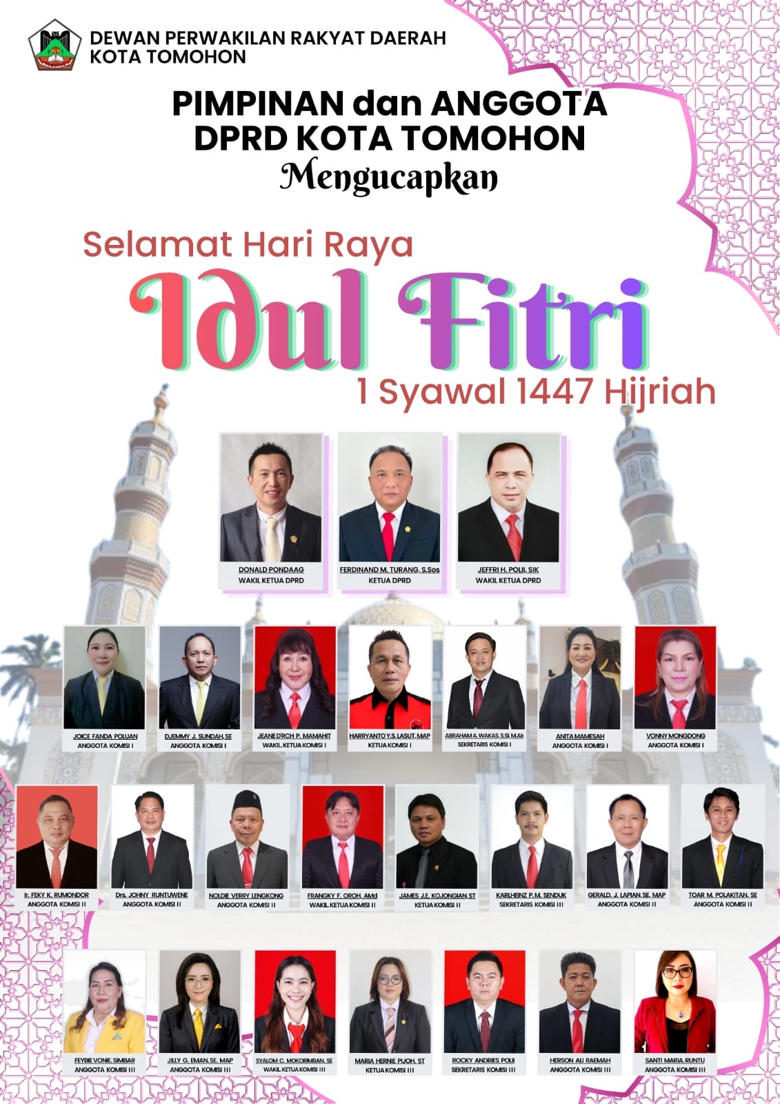 datatimes.id, Tomohon – Dewan Perwakilan Rakyat Daerah (DPRD) Kota Tomohon menyampaikan ucapan Selamat Hari Raya Idul Fitri 1 Syawal 1447 Hijriah kepada seluruh masyarakat kota Tomohon.